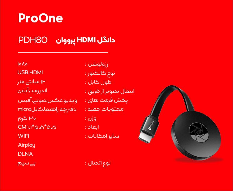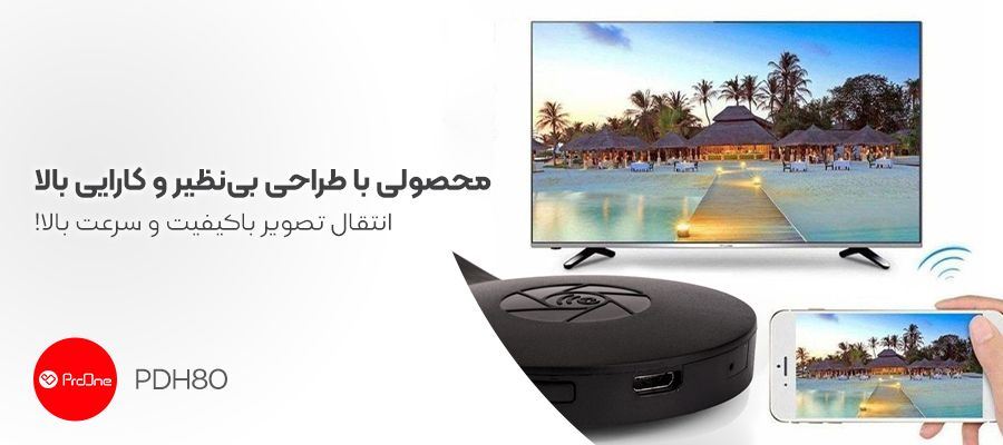 امروزه، استفاده از رابط و کابل HDMI توسط مردم گسترش یافته و این موضوع باعث شده تا سایر رابط ها و درگاه های منتقل کننده صدا و تصویر، به فراموشی سپرده شوند؛ زیرا کابل HDMI می تواند تصاویر و صداها را بدون افت کیفیت انتقال دهد. این کابل ها برای نخستین بار در سال 2003 معرفی شدند و از همان زمان تاکنون، به عنوان ابزاری بسیار مهم و کاربردی شناخته می شوند. طی سال های اخیر، بر تنوع کابل های HDMI افزوده شده و حتی این نوع رابط به صورت دانگل هم در دسترس کاربران قرار گرفته است؛ به طوری که می توان از آن برای اتصال گوشی های هوشمند به مانیتورها و تلویزیون ها استفاده کرد. دانگل HDMI “پرووان” (ProOne) مدل PDH80 یکی از بهترین و باکیفیت ترین محصولات در این زمینه است که امکانات متنوعی همچون وضوح تصویر 1080 و پشتیبانی از WiFi را پوشش می دهد؛ همچنین گفتنی است که این مدل دانگل HDMI، از ویژگی AirPlay نیز پشتیبانی کرده و امکان پخش تصاویر تبلت ها و گوشی های مبتنی بر سیستم عامل اندروید و iOS در تلویزیون ها یا مانیتورهای اداری دارای درگاه HDMI را بدون نیاز به کابل فراهم می کند. در ادامه، به طور کامل با ویژگی های این محصول آشنا خواهید شد.